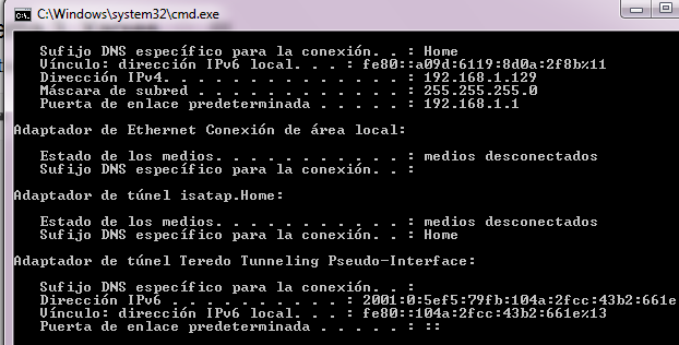 2-Información de retorno. En la tercera línea se verá la IP asignada al ordenador: 192.168.1.129. La cuarta línea muestra la dirección IP del router local o router a través del cual establecemos comunicación: 192.168.1.1